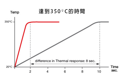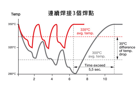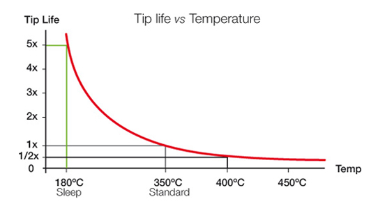 使用較低的作業溫度和更短的操作時間,烙鐵頭的壽命可以成倍的增加,如在圖中顯示的。