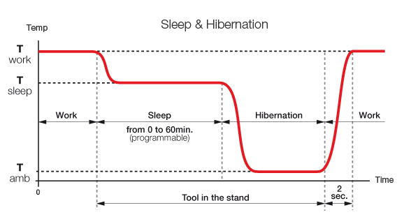 當焊具被放在焊具座上面時,睡眠功能會啟動並自動降低烙鐵頭的溫度至180ºC(可設置的)。
