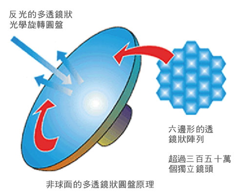 在Vision Engineering的專利高能光學擴大光瞳技術的核心有一個透明的多透鏡轉盤,它由上百萬個透鏡所組成,每個僅幾微米直徑的透鏡作為獨立的圖像生成表面。