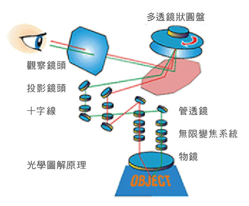 在Vision Engineering顯微鏡Lynx®的高能光學™ (Dynascope™)裡,直徑148 毫米的多透鏡轉盤表面組合著超過350萬個獨立透鏡,每個透鏡的大小僅為70微米。高能光學™轉盤以每分鐘3400轉的角速度旋轉從而彙聚數百萬條的獨立光軸線,透出射一個景深清晰和視野廣闊的流暢擴大光瞳立體成像。