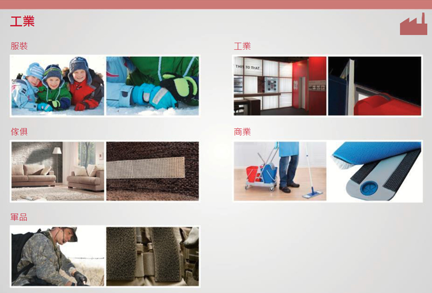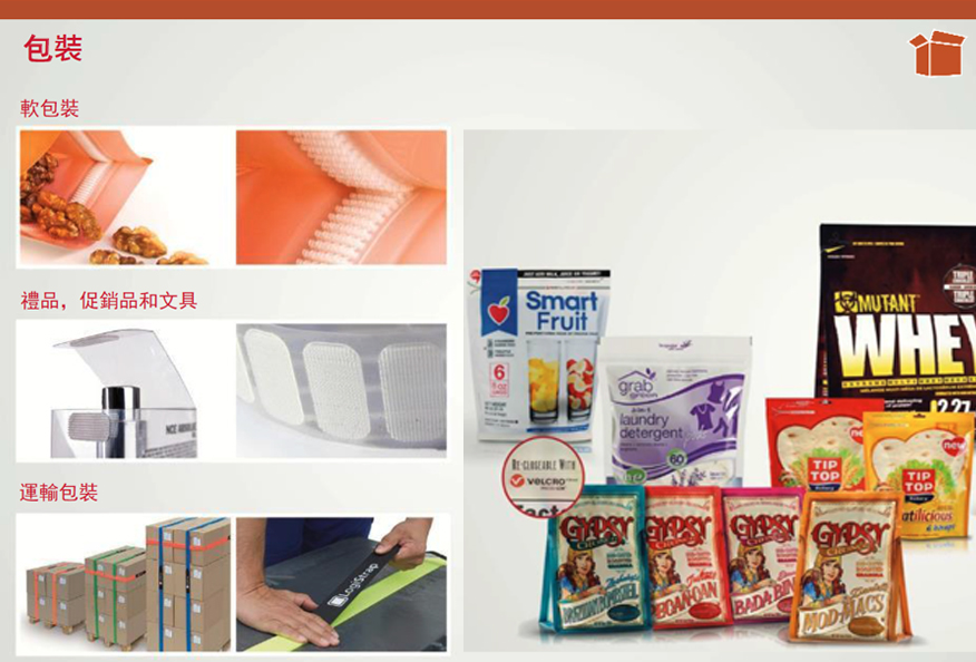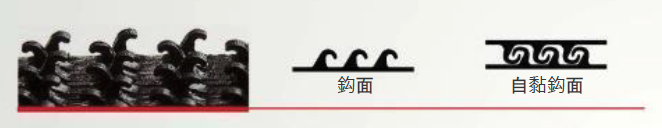 鈎面與毛面在相對側擠壓黏扣帶採用設計精巧的模塑鉤面,性能出眾,可與各種編織、針織或不織布毛面帶搭配使用。